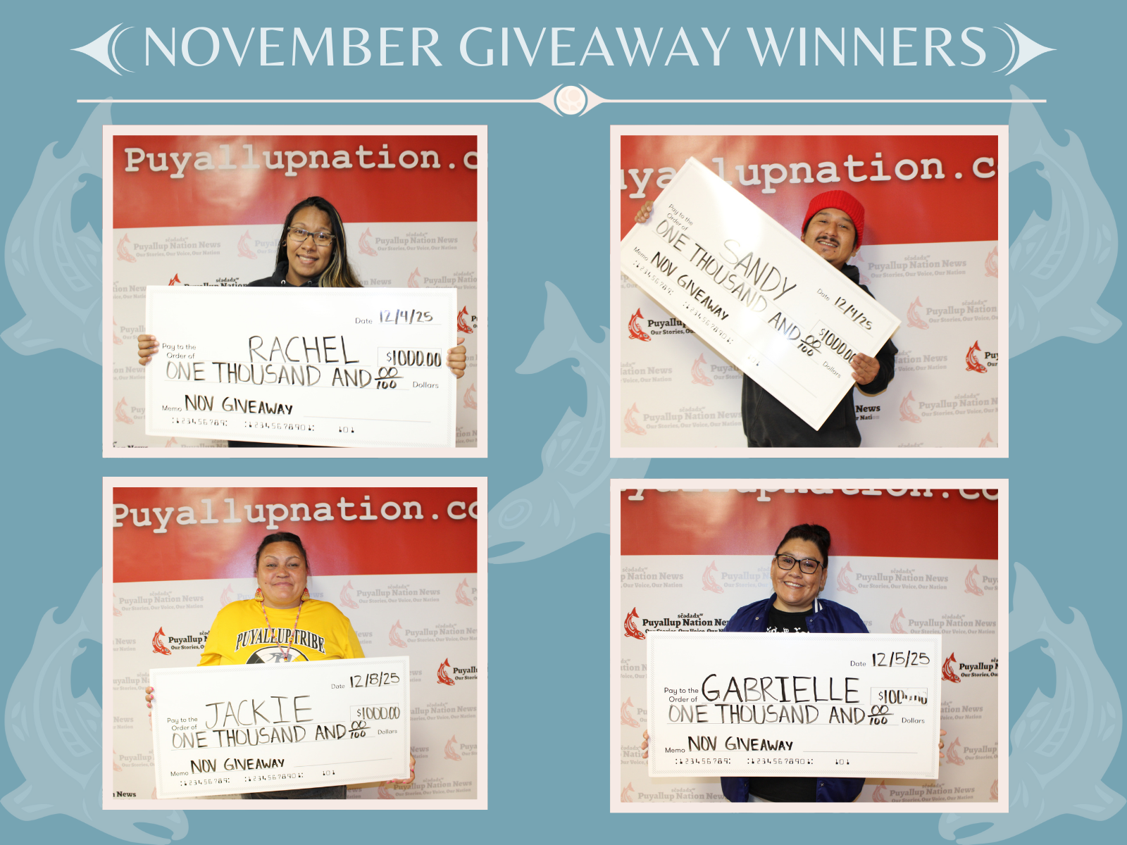 As a reminder, December is a new month with new giveaways for Puyallup Nation News. Moving forward, we will be giving out five $1000 prizes per month to registered Puyallup Tribal members over the age of 18 who complete our registration form. No fees, no strings attached. Sign up now for your chance to win.