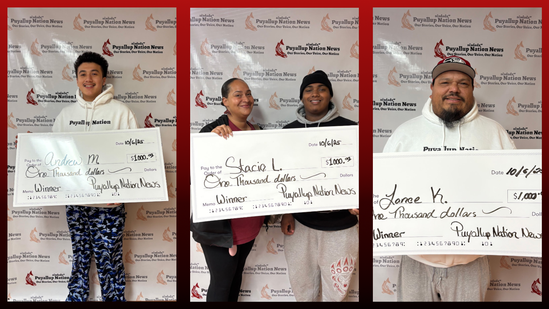 As a reminder, October is a new month with new giveaways for Puyallup Nation News. Moving forward, we will be giving out five $1000 prizes per month to registered Puyallup Tribal members over the age of 18 who complete our registration form. No fees, no strings attached. Sign up now for your chance to win.